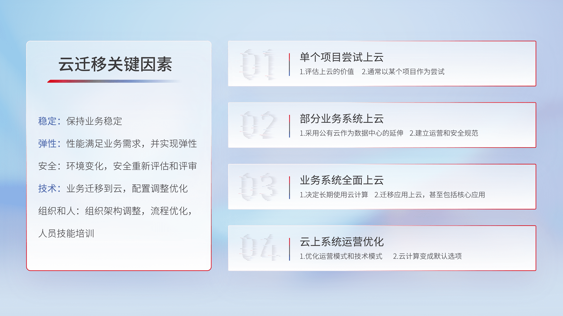 结合实际业务,,,从规划设计、、云平台选型、、、、云原生改造、、、数据迁移、、、集成交付,,迁移全过程为客户识别最佳上云路径,,,做好风险识别管理,,设计网络架构、、、、身份权限、、安全审计合规、、、操作审计、、、日志审计、、、、监控告警策略、、、多站点容灾设计等,,,,对云上基础设施进行整体规划,,,提升IT治理水平,,,,以满足弹性、、、高可用、、、高性能的需求。。。