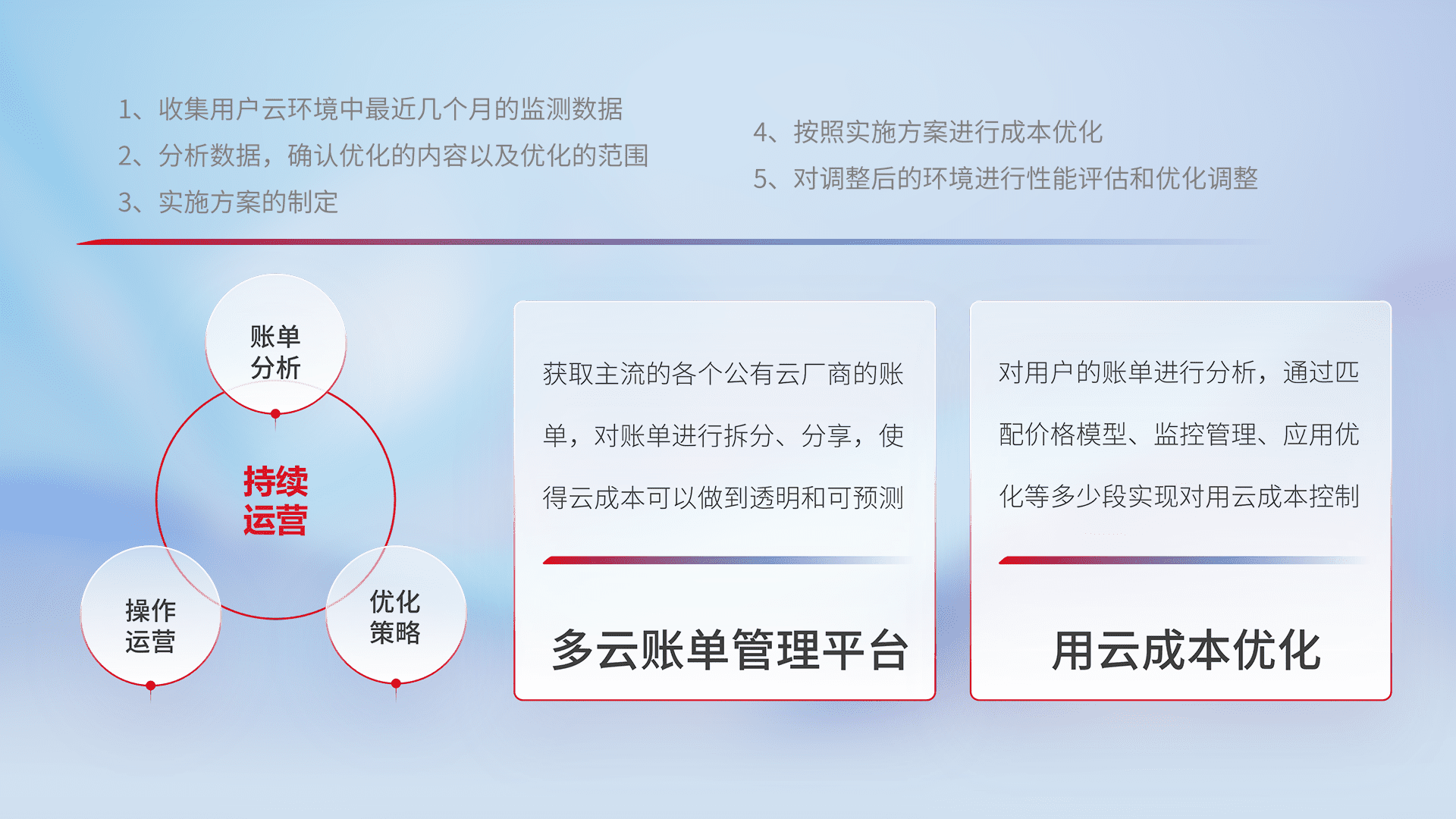 通过多云纳管,,,以统一的资源数据模型把客户的云资源进行抽象和封装,,,进而实现对多云资源的统一操作,,保障云资源管理的可靠性、、、稳定性与可用性。。。量身定制化运维内容,,配置、、、开发运维、、补丁管理、、、、备份、、、监控、、认证和访问管理、、、、审计和日常巡检等,,保障在用云过程中的可靠度,,稳定度以及高可用率。。。。